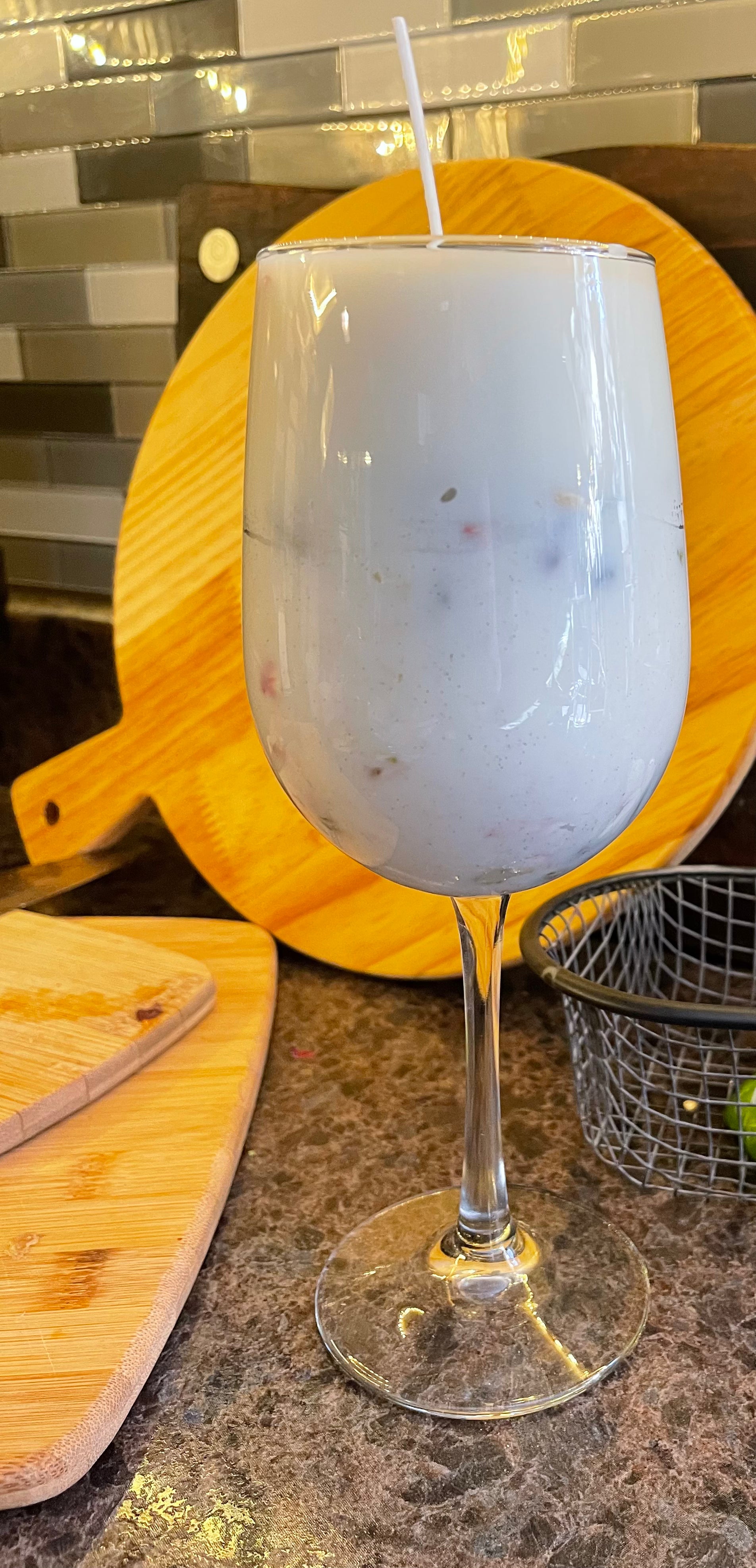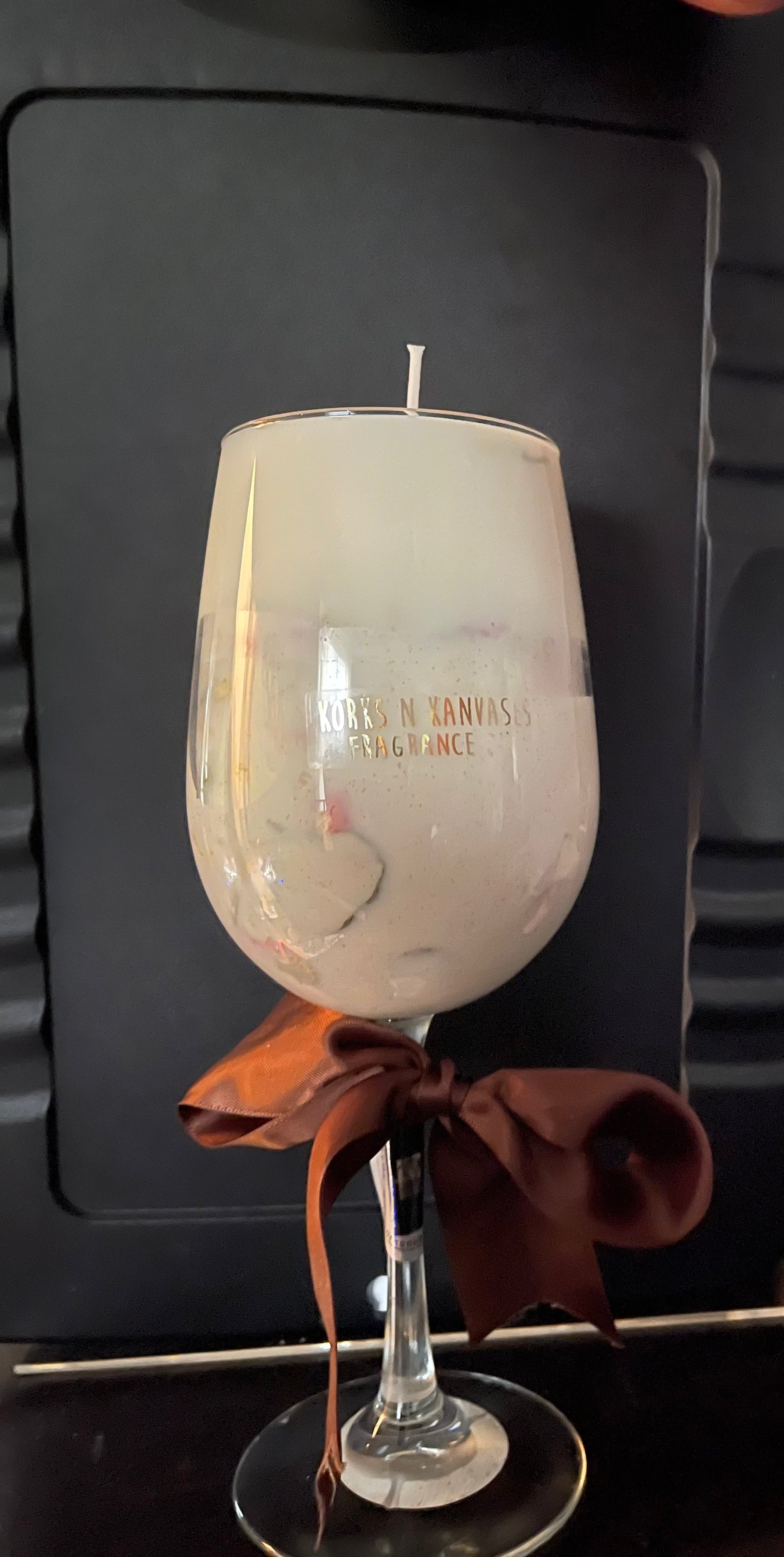 Our delicious smelling Blank Kanvas scent with a variety of dried florals in a flora 12oz wine glass